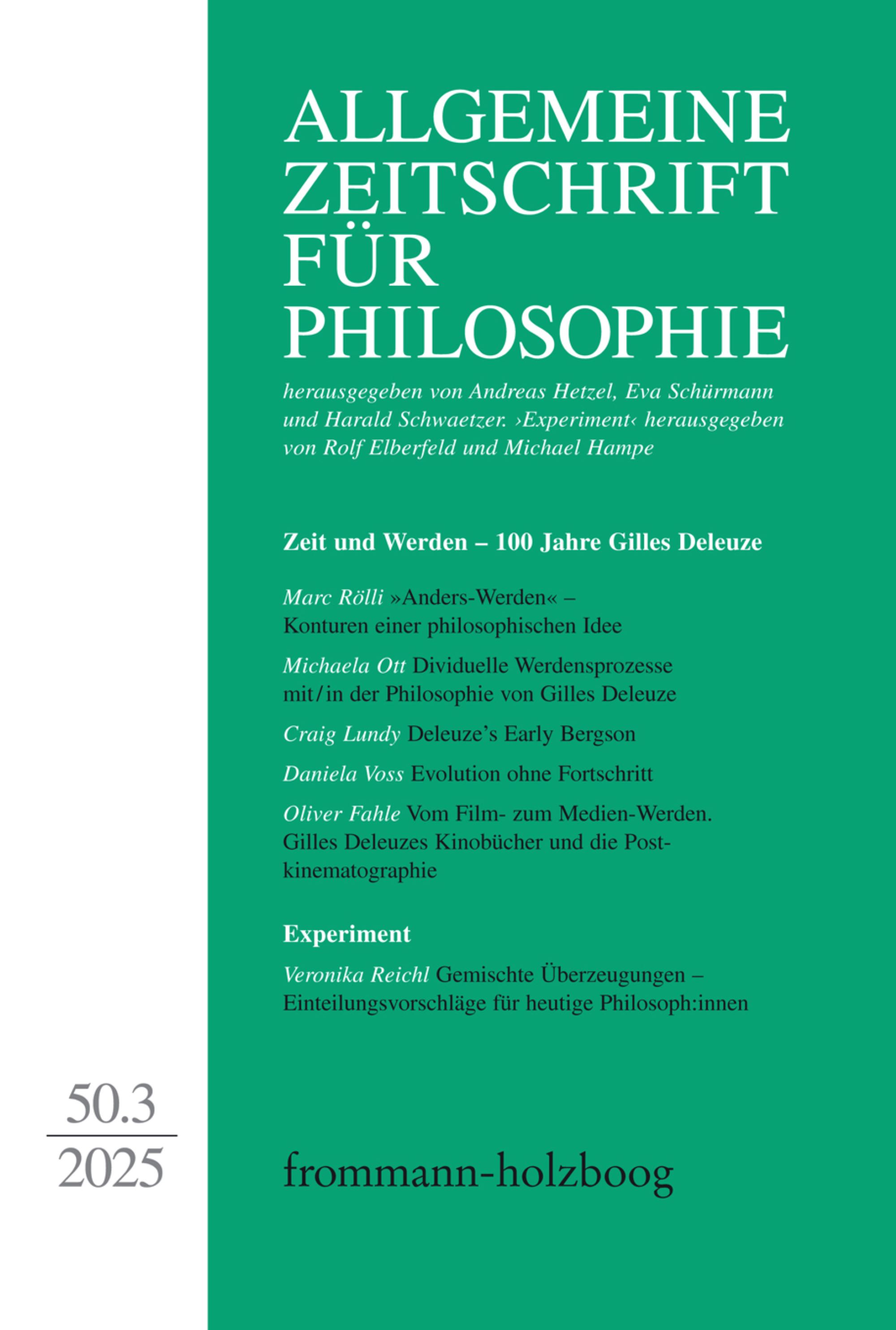 Zum 100. Geburtstag von Gilles Deleuze stellt dieses Schwerpunktheft zwei Schlüsselbegriffe seiner Prozessphilosophie in den Mittelpunkt: Zeit und Werden. Deleuzes vielschichtige Konzeption der Zeit, die er entlang der Begriffe Differenz und Wiederholung entwickelt, sowie die verschiedenen Weisen des Werdens, die er besonders in den gemeinsam mit Félix Guattari verfassten Werken thematisiert, verbinden Metaphysik, Ästhetik, Ethik und Politisch-Soziales. Die Beiträge des Heftes zeigen die fortdauernde Vitalität dieses Denkens auf und suchen es in Antwort auf unsere Gegenwart zu aktualisieren. Sie befragen Konzeptionen des Fortschritts, der Evolution, des Anders- und postkolonialen Werdens sowie die Entwicklung neuer Bildtypen in der Konvergenz von Film und anderer audiovisueller Medien.